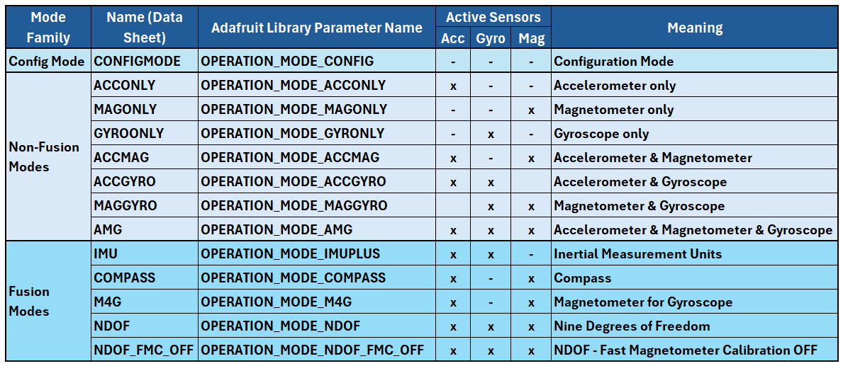 Das Magnetometer, das Gyroskop und das Magnetometer sind die eigentlichen Sensoren des BNO055. Das Tolle am BNO055 ist, dass er diese Daten kombinieren kann, um daraus die absolute Ausrichtung im Raum zu berechnen oder um die Erdbeschleunigung (Gravity) von der durch Bewegung wirkenden Beschleunigung (Linear Acceleration) zu trennen. Die Kombinationswerte erhaltet ihr in den sogenannten Fusion-Modi. Wollt ihr einfach nur die blanken Sensordaten, könnt ihr die Non-Fusion-Modi verwenden. Hier die Übersicht über alle Modi: