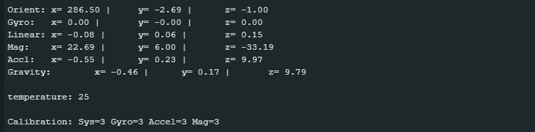 In den Fusion-Modi kalibriert sich der BNO055 selbst, und das während des laufenden Betriebs. Der Kalibrierstatus der Sensoren wird auf einer Skala von 0 bis 3 bewertet. Je höher der Wert, desto besser die Kalibrierung und desto verlässlicher sind die Messwerte.