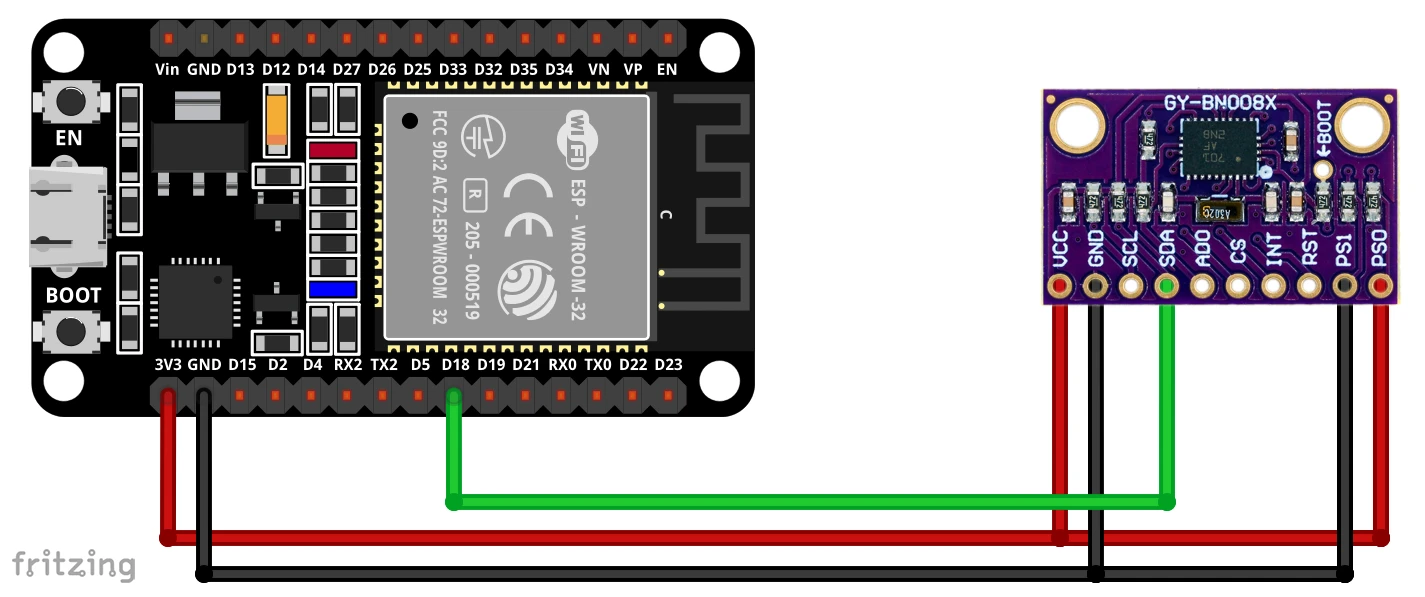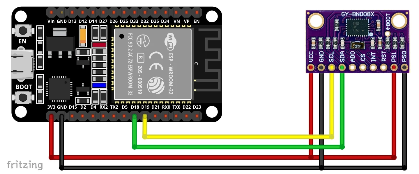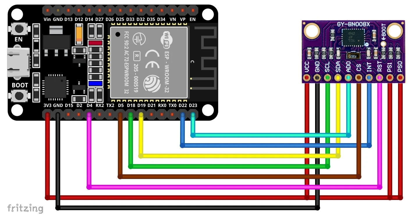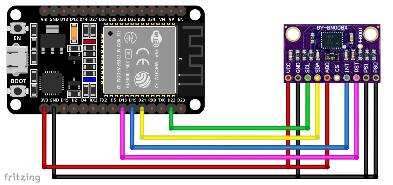 Hier ein Beispiel für den Anschluss des No-Name-BNO08x-Moduls an ein ESP32-Development Board per SPI:
