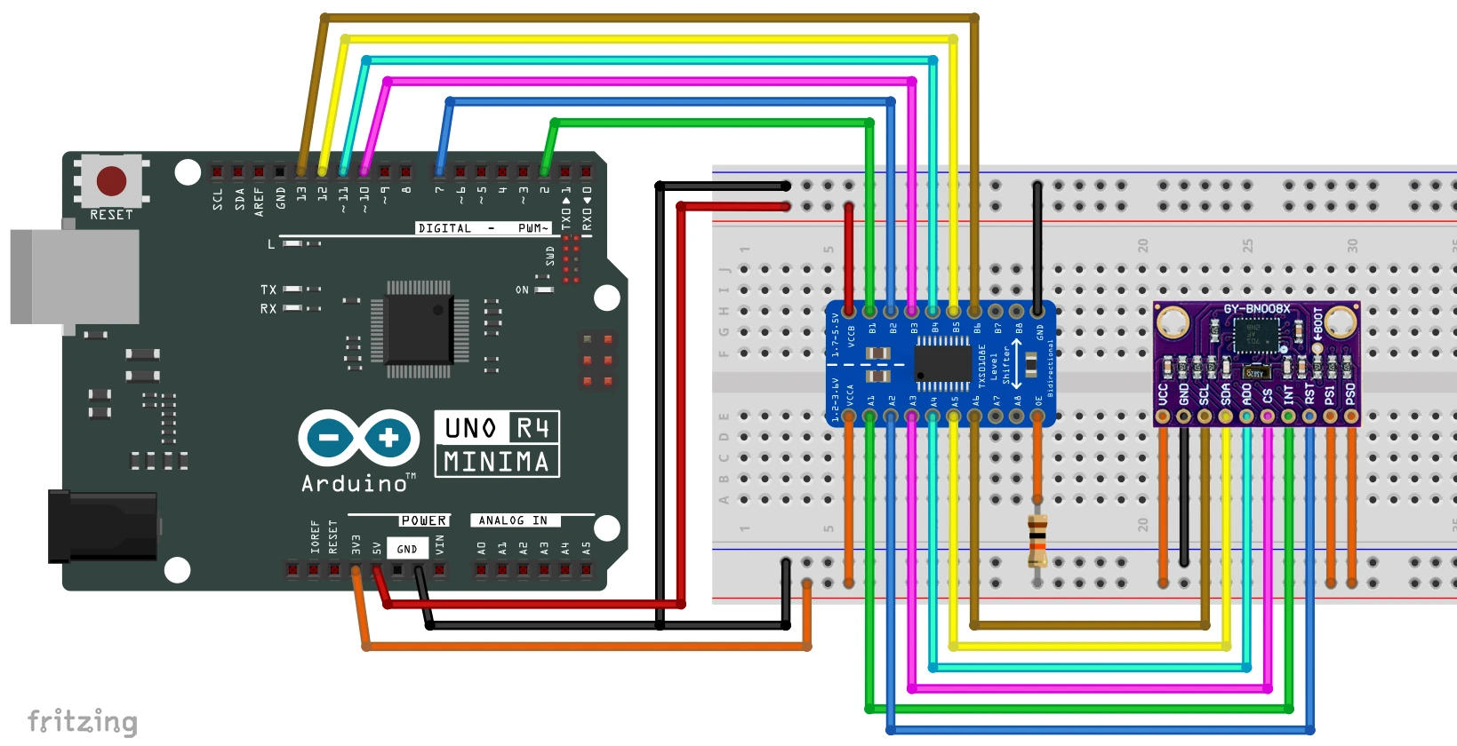 Und zum Schluss wollte ich noch zeigen, dass ihr natürlich auch 5-Volt-Boards wie den Arduino UNO R4 Minima verwenden könnt. Wenn ihr kein 5-Volt-fähiges BNO08x-Modul wie das von Adafruit habt, müsst ihr einen Levelshifter (z.B. den TXS0108E) verwenden. Trotzdem gilt natürlich immer noch, dass euer Mikrocontrollerboard den hohen Ansprüchen an den Arbeitsspeicher genügen muss.