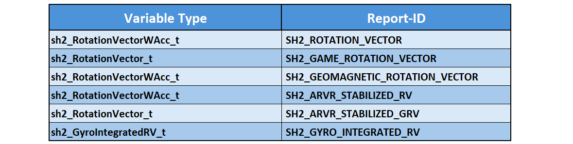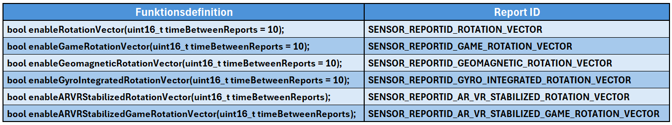 • AR/VR Stabilized Rotation Vector: Korrigierte Variante (siehe Datenblatt, Abschnitt 2.2.5).